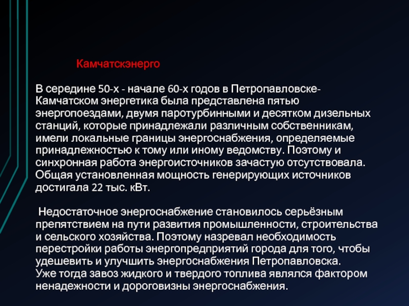 Уже тогда завоз жидкого и твердого топлива являлся фактором ненадежности и дороговизны энергоснабжения.