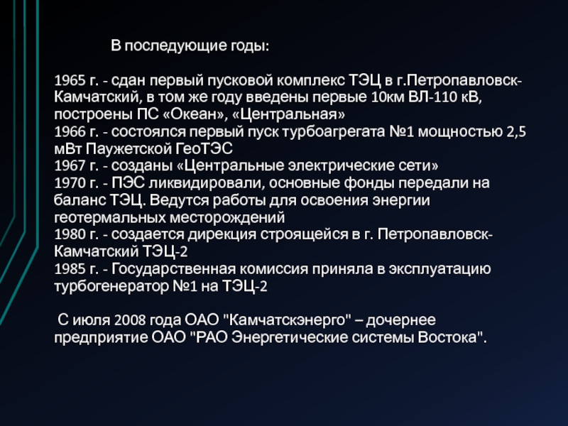 1970 г. - ПЭС ликвидировали, основные фонды передали на баланс ТЭЦ. Ведутся работы для освоения энергии геотермальных месторождений