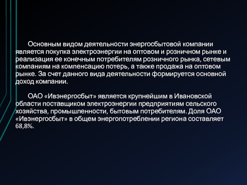 Слайд 5 Основным видом деятельности энергосбытовой компании является покупка электроэнергии на оптовом