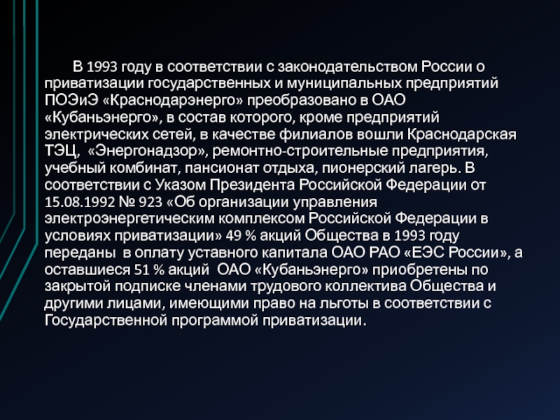 в состав которого, кроме предприятий электрических сетей, в качестве филиалов вошли Краснодарская ТЭЦ, «Энергонадзор», ремонтно-строительные предприятия, учебный комбинат, пансионат отдыха, пионерский лагерь. В соответствии с Указом Президента Российской Федерации от 15.08.1992 № 923 «Об организации управления электроэнергетическим комплексом Российской Федерации в условиях приватизации» 49 % акций Общества в 1993 году переданы в оплату уставного капитала ОАО РАО «ЕЭС России», а оставшиеся 51 % акций ОАО «Кубаньэнерго» приобретены по закрытой подписке членами трудового коллектива Общества и другими лицами, имеющими право на льготы в соответствии с Государственной программой приватизации.