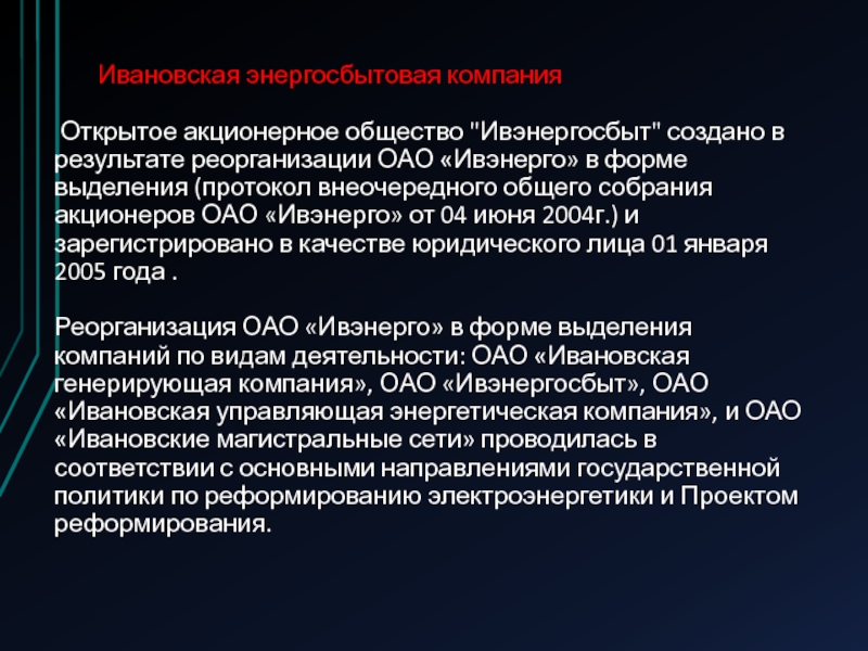 Реорганизация ОАО «Ивэнерго» в форме выделения компаний по видам деятельности: ОАО «Ивановская генерирующая компания», ОАО «Ивэнергосбыт», ОАО «Ивановская управляющая энергетическая компания», и ОАО «Ивановские магистральные сети» проводилась в соответствии с основными направлениями государственной политики по реформированию электроэнергетики и Проектом реформирования.
