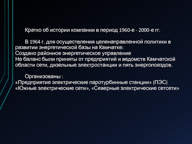 На баланс были приняты от предприятий и ведомств Камчатской области сети, дизельные электростанции и пять энергопоездов.