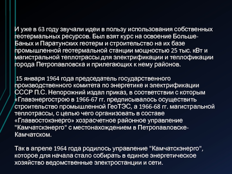 Паратунских геотерм и строительство на их базе промышленной геотермальной станции мощностью 25 тыс. кВт и магистральной теплотрассы для электрификации и теплофикации города Петропавловска и прилегающих к нему районов.