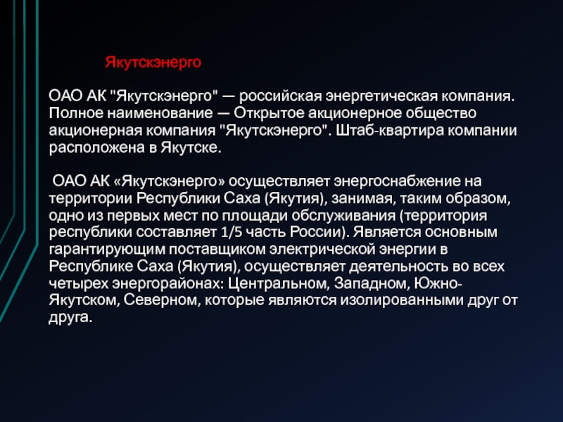 Открытое акционерное общество акционерная компания "Якутскэнерго". Штаб-квартира компании расположена в