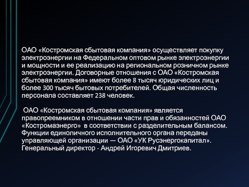 рынке электроэнергии. Договорные отношения с ОАО «Костромская сбытовая компания» имеют более 8 тысяч юридических лиц и более 300 тысяч бытовых потребителей. Общая численность персонала составляет 238 человек.