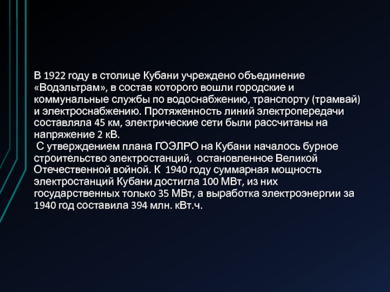 Слайд 16В 1922 году в столице Кубани учреждено объединение «Водэльтрам», в