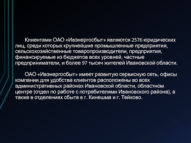 Слайд 6 Клиентами ОАО «Ивэнергосбыт» являются 2576 юридических лиц, среди которых крупнейшие