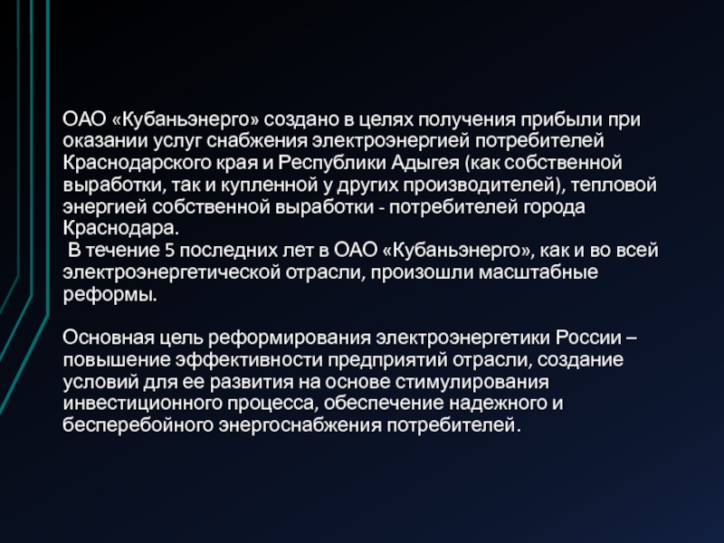 Слайд 18ОАО «Кубаньэнерго» создано в целях получения прибыли при оказании услуг