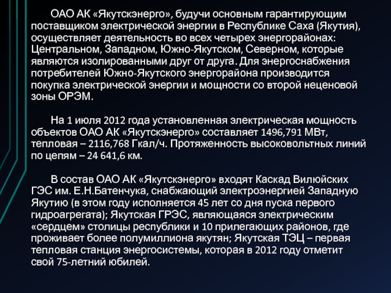 Республике Саха (Якутия), осуществляет деятельность во всех четырех энергорайонах: Центральном,
