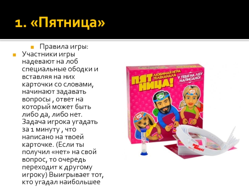 ответ на который может быть либо да, либо нет. Задача игрока угадать за 1 минуту , что написано на твоей карточке. (Если ты получил «нет» на свой вопрос, то очередь переходит к другому игроку) Выигрывает тот, кто угадал наибольшее количество слов