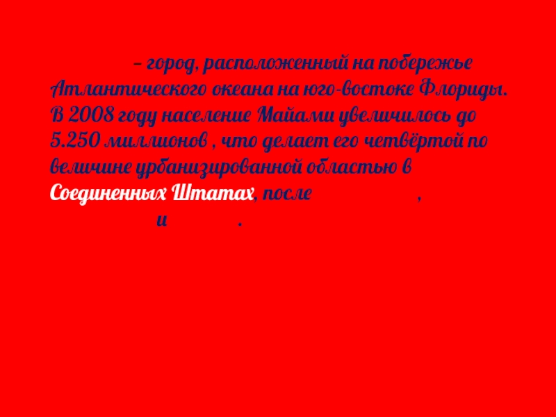 Слайд 3Майами — город, расположенный на побережье Атлантического океана на юго-востоке Флориды. В 2008 году
