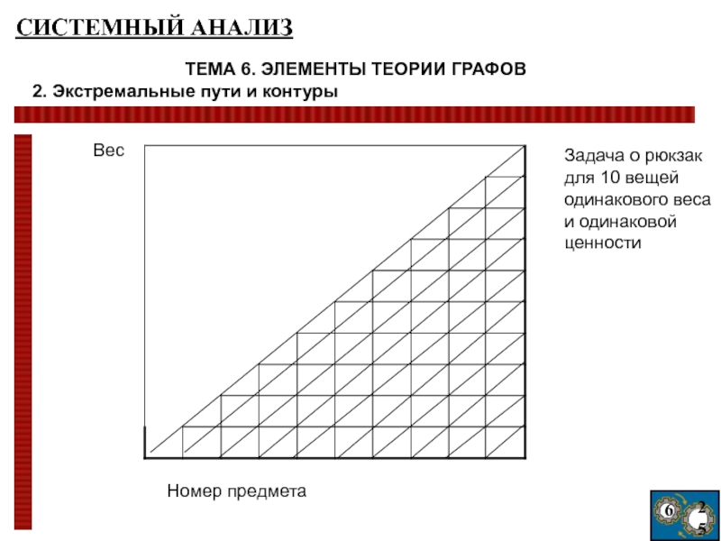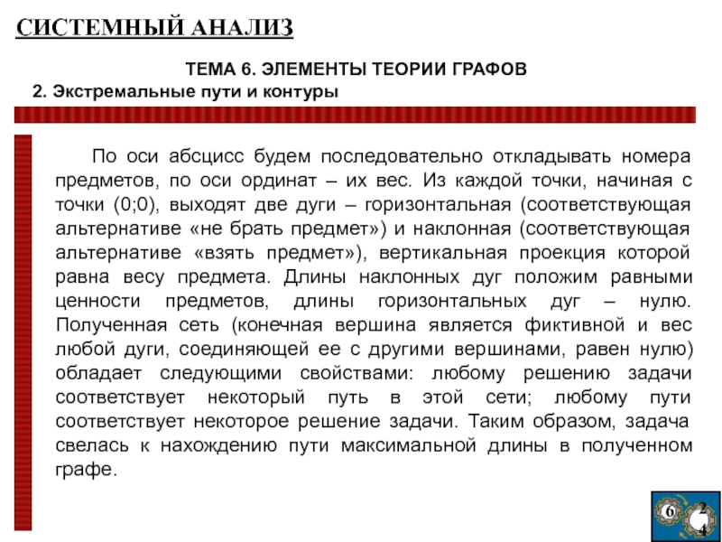 ординат – их вес. Из каждой точки, начиная с точки (0;0), выходят две дуги – горизонтальная (соответствующая альтернативе «не брать предмет») и наклонная (соответствующая альтернативе «взять предмет»), вертикальная проекция которой равна весу предмета. Длины наклонных дуг положим равными ценности предметов, длины горизонтальных дуг – нулю. Полученная сеть (конечная вершина является фиктивной и вес любой дуги, соединяющей ее с другими вершинами, равен нулю) обладает следующими свойствами: любому решению задачи соответствует некоторый путь в этой сети; любому пути соответствует некоторое решение задачи. Таким образом, задача свелась к нахождению пути максимальной длины в полученном графе.