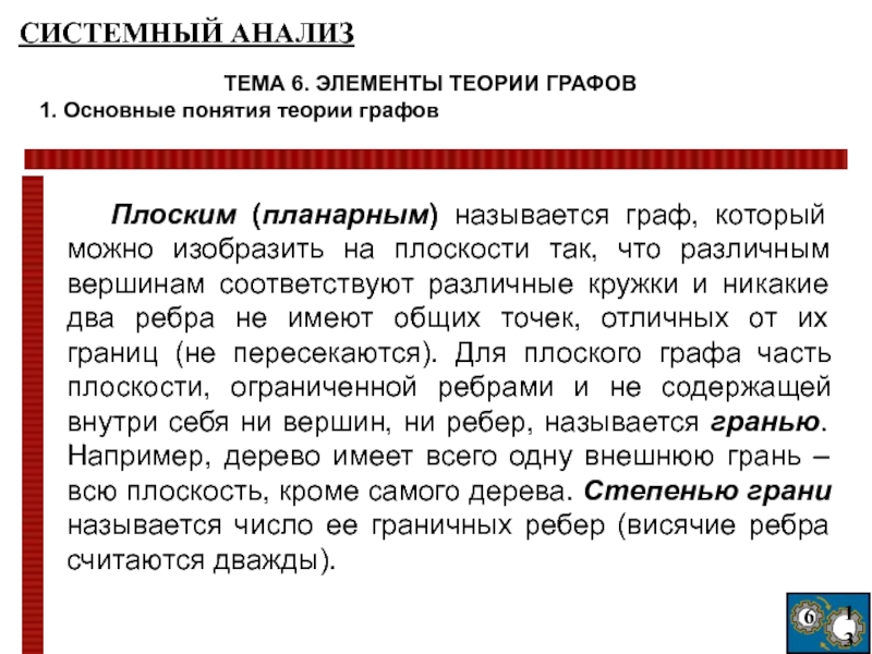 что различным вершинам соответствуют различные кружки и никакие два ребра не имеют общих точек, отличных от их границ (не пересекаются). Для плоского графа часть плоскости, ограниченной ребрами и не содержащей внутри себя ни вершин, ни ребер, называется гранью. Например, дерево имеет всего одну внешнюю грань – всю плоскость, кроме самого дерева. Степенью грани называется число ее граничных ребер (висячие ребра считаются дважды).