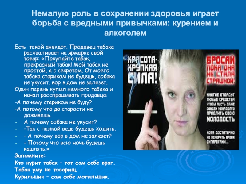 Слайд 9Немалую роль в сохранении здоровья играет борьба с вредными привычками: