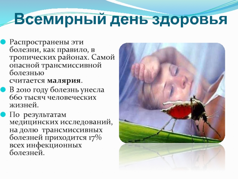 По результатам медицинских исследований, на долю трансмиссивных болезней приходится 17% всех инфекционных болезней.
