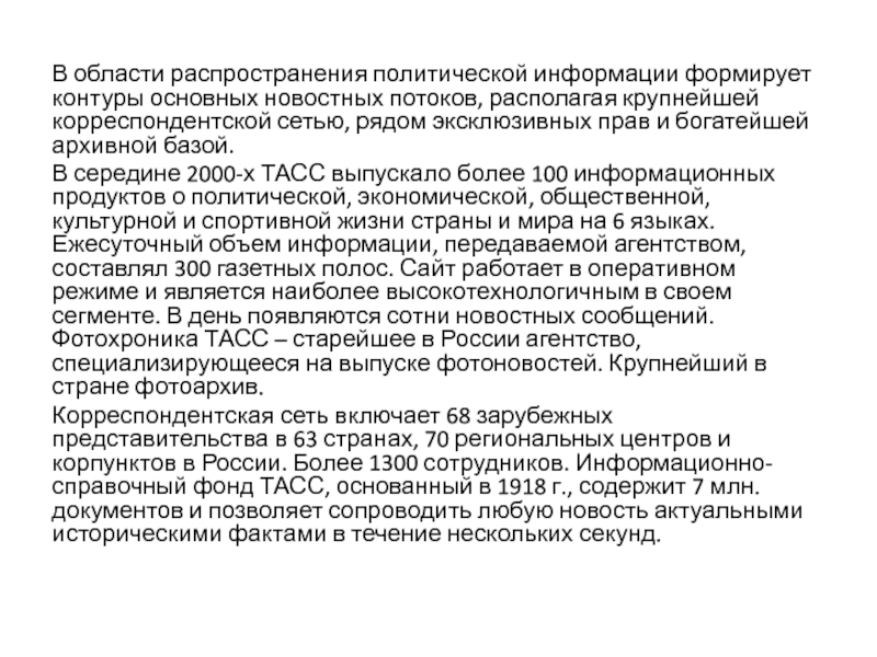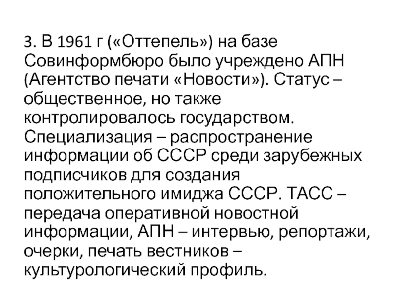 государством. Специализация – распространение информации об СССР среди зарубежных подписчиков для создания положительного имиджа СССР. ТАСС – передача оперативной новостной информации, АПН – интервью, репортажи, очерки, печать вестников – культурологический профиль.