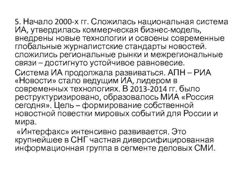 Система ИА продолжала развиваться. АПН – РИА «Новости» стало ведущим ИА, лидером в современных технологиях. В 2013-2014 гг. было реструктуризировано, образовалось МИА «Россия сегодня». Цель – формирование собственной новостной повестки мировых событий для России и мира.