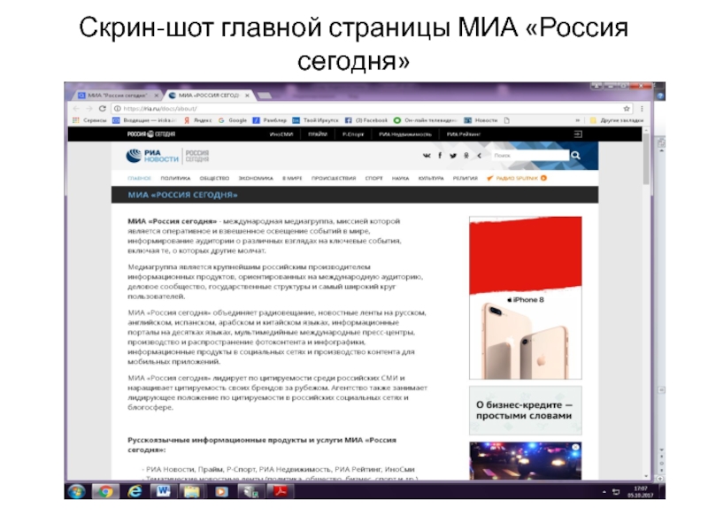 Слайд 18Скрин-шот главной страницы МИА «Россия сегодня»