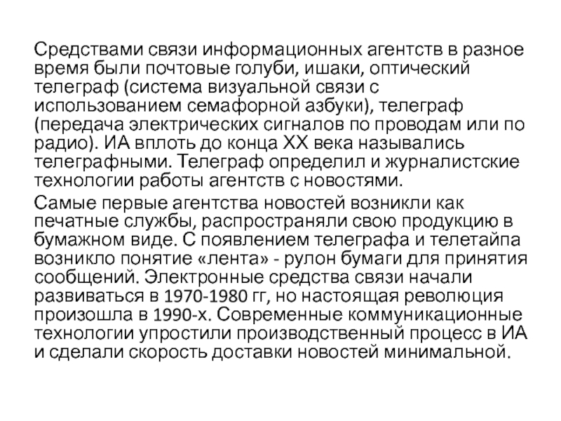 Слайд 38Средствами связи информационных агентств в разное время были почтовые голуби,