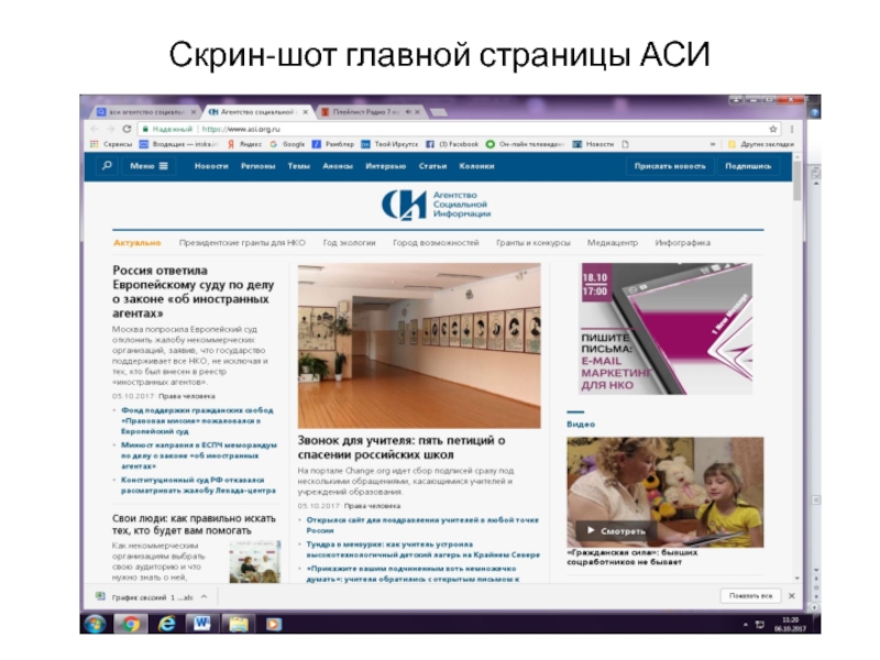 Новости о социально значимых событиях, деятельности некоммерческих организаций. Вне политики и коммерции. Большая корсеть в десятках городах России, бесплатно распространяет новости в свободном доступе, обновляя их в режиме реального времени. АСИ не только информирует, но и инициирует проекты и акции, проводит просветительские кампании, продвигает социальные инициативы (фестивали, конференции, круглые столы, выставки), занимается производством социальной рекламы.