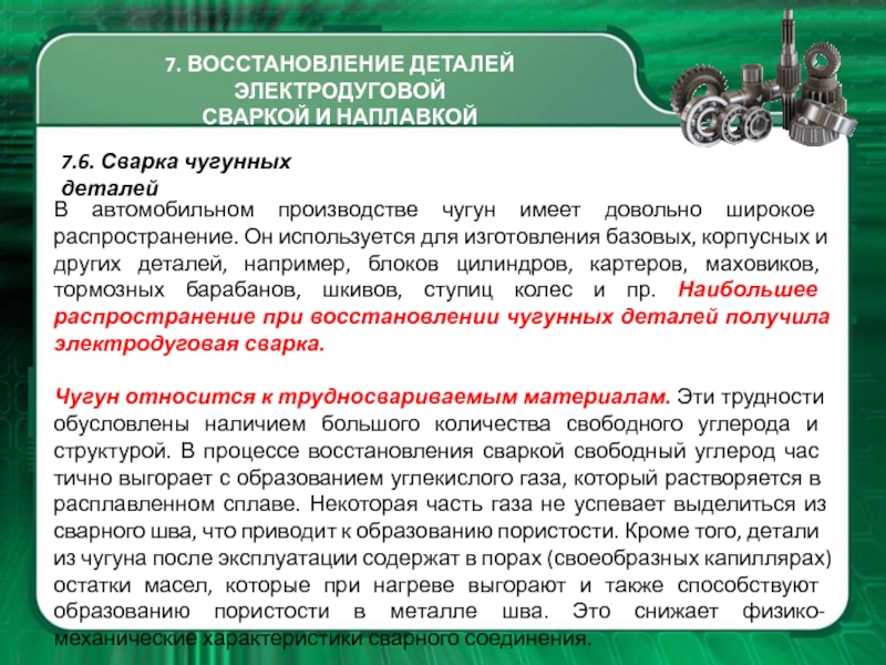 базовых, корпусных и других деталей, например, блоков цилиндров, картеров, маховиков, тормозных барабанов, шкивов, ступиц колес и пр. Наибольшее распространение при восстановлении чугунных деталей получила электродуговая сварка.