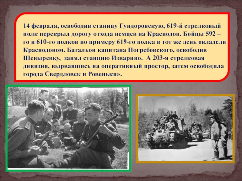 14 февраля, освободив станицу Гундоровскую, 619-й стрелковый полк перекрыл дорогу
