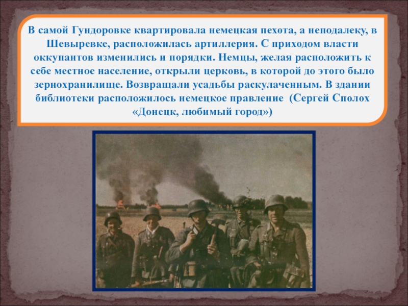 Слайд 6В самой Гундоровке квартировала немецкая пехота, а неподалеку, в Шевыревке,