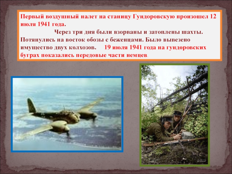 Слайд 5Первый воздушный налет на станицу Гундоровскую произошел 12 июля 1941