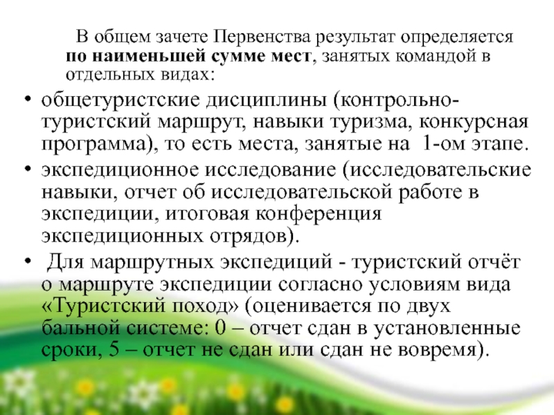 Для маршрутных экспедиций - туристский отчёт о маршруте экспедиции согласно условиям вида «Туристский поход» (оценивается по двух бальной системе: 0 – отчет сдан в установленные сроки, 5 – отчет не сдан или сдан не вовремя).