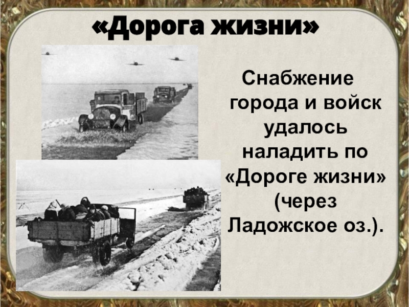 «Дорога жизни»Снабжение города и войск удалось наладить по «Дороге жизни» (через Ладожское оз.).