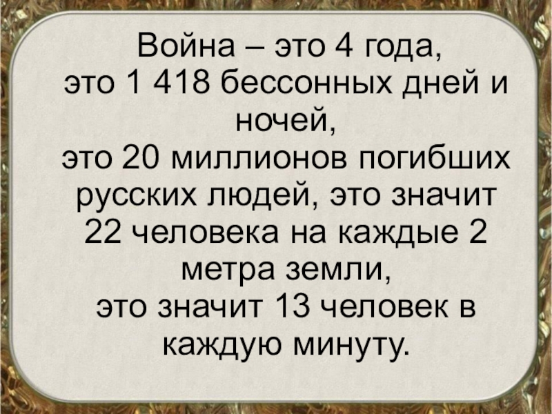 Слайд 12 Война – это 4 года, это 1 418 бессонных дней и
