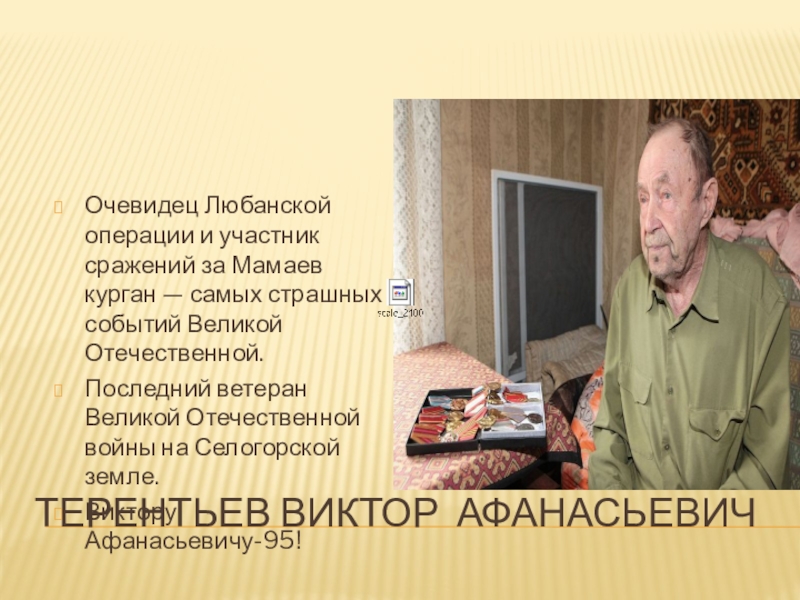 Терентьев Виктор АфанасьевичОчевидец Любанской операции и участник сражений за Мамаев курган — самых страшных событий Великой Отечественной.Последний