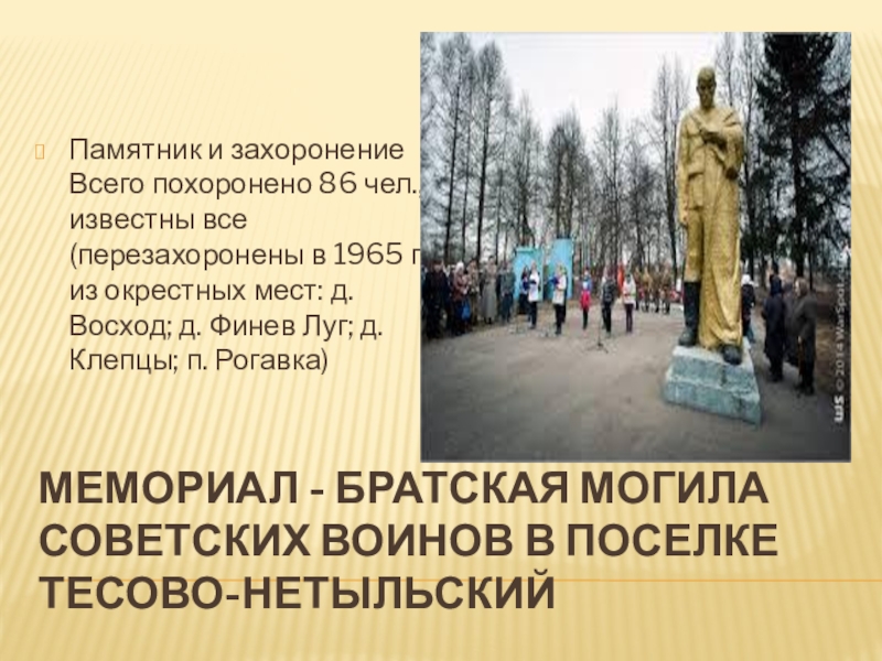 Мемориал - Братская могила советских воинов в поселке Тесово-Нетыльский Памятник и захоронение Всего похоронено 86 чел., известны