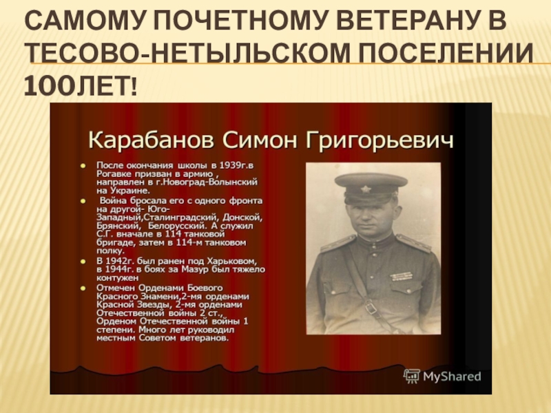 Слайд 7Самому почетному ветерану в Тесово-Нетыльском поселении 100лет!