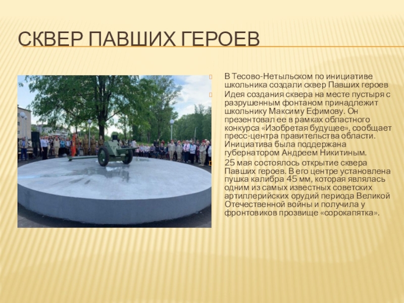 Сквер павших героевВ Тесово-Нетыльском по инициативе школьника создали сквер Павших героевИдея создания сквера на месте пустыря с