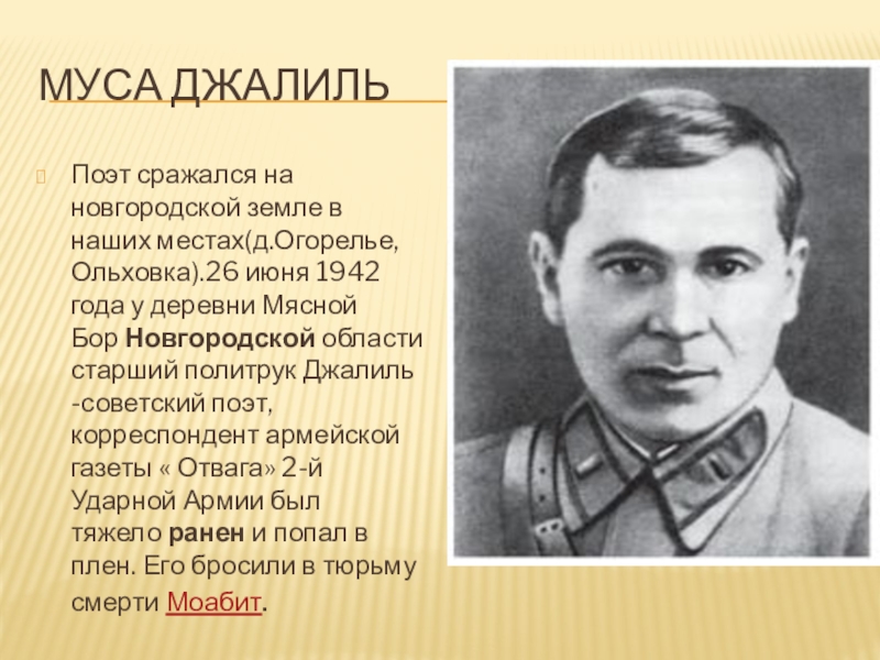 Муса ДжалильПоэт сражался на новгородской земле в наших местах(д.Огорелье, Ольховка).26 июня 1942 года у деревни Мясной Бор Новгородской области