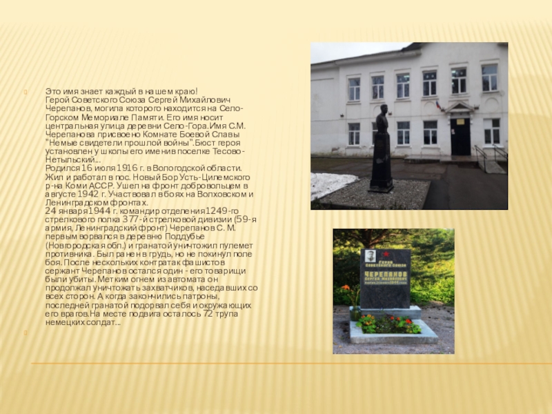 Это имя знает каждый в нашем краю! Герой Советского Союза Сергей Михайлович Черепанов, могила которого находится на Село-Горском Мемориале Памяти. Его имя носит центральная улица деревни Село-Гора.Имя С.М.Черепанова присвоено Комнате Боевой