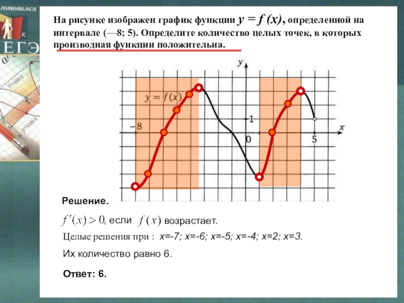 Определение количества целых точек, в которых производная функции отрицательна, положительна.