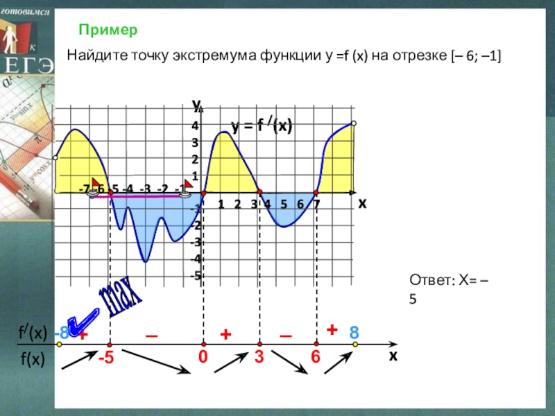 Задание Примерy = f /(x) 4321-1-2-3-4-5yx+––++Найдите точку экстремума функции у =f (x) на Примерy = f /(x) 4321-1-2-3-4-5yx+––++Найдите точку экстремума функции у =f (x) на отрезке [– 6; –1]Ответ: Х= –](/img/tmb/6/576556/1ff53e55a63b45a5878f54a59fe33b45-800x.jpg)