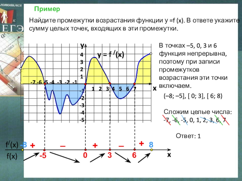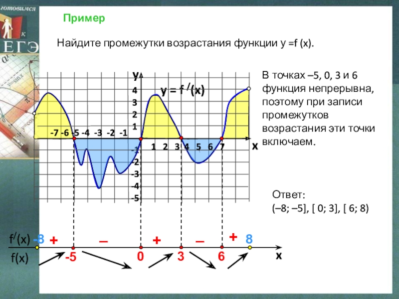 Задание Примерy = f /(x) 4321-1-2-3-4-5yx+––++В какой точке отрезка [– 4; –1] функции Примерy = f /(x) 4321-1-2-3-4-5yx+––++В какой точке отрезка [– 4; –1] функции у =f (x) принимает наибольшее значение?](/img/tmb/6/576556/384d5ef3239a05440ee6b109b0783891-800x.jpg)