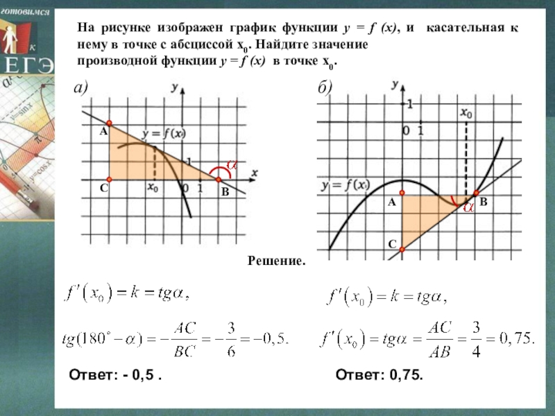 функции, точек максимума и минимума по графику функции.Нахождение значения производной в заданной точке, если задан график функции и касательная к нему.