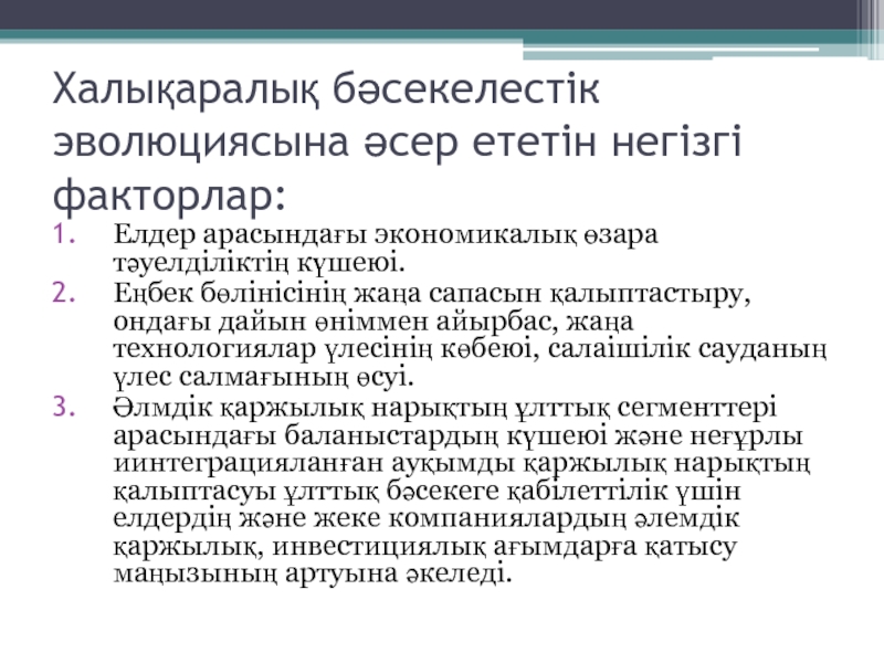 Слайд 3Халықаралық бәсекелестік эволюциясына әсер ететін негізгі факторлар: