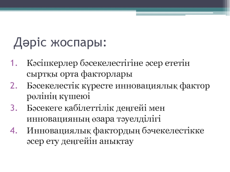 Дәріс жоспары:Кәсіпкерлер бәсекелестігіне әсер ететін сыртқы орта факторларыБәсекелестік күресте инновациялық фактор рөлінің күшеюіБәсекеге қабілеттілік деңгейі мен инновацияның