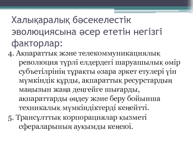 Слайд 4Халықаралық бәсекелестік эволюциясына әсер ететін негізгі факторлар: