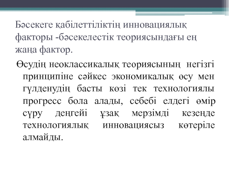 Бәсекеге қабілеттіліктің инновациялық факторы -бәсекелестік теориясындағы ең жаңа фактор.Өсудің неоклассикалық теориясының негізгі принципіне сәйкес экономикалық өсу мен