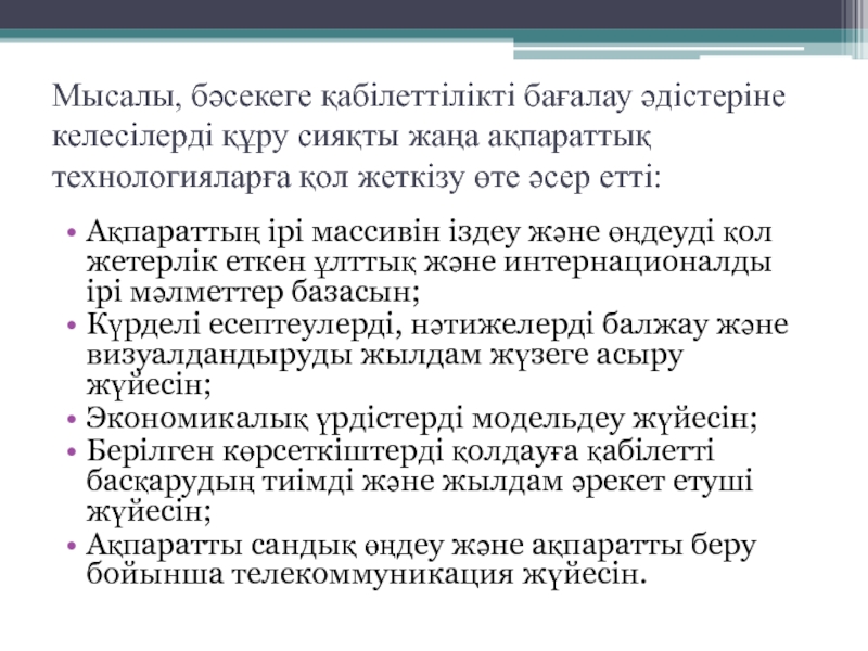 Слайд 6Мысалы, бәсекеге қабілеттілікті бағалау әдістеріне келесілерді құру сияқты жаңа ақпараттық
