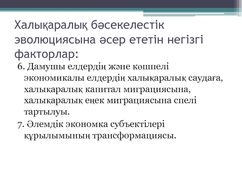 Слайд 5Халықаралық бәсекелестік эволюциясына әсер ететін негізгі факторлар: