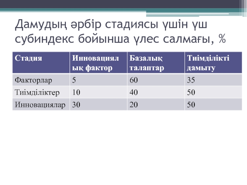 Слайд 9Дамудың әрбір стадиясы үшін үш субиндекс бойынша үлес салмағы, %