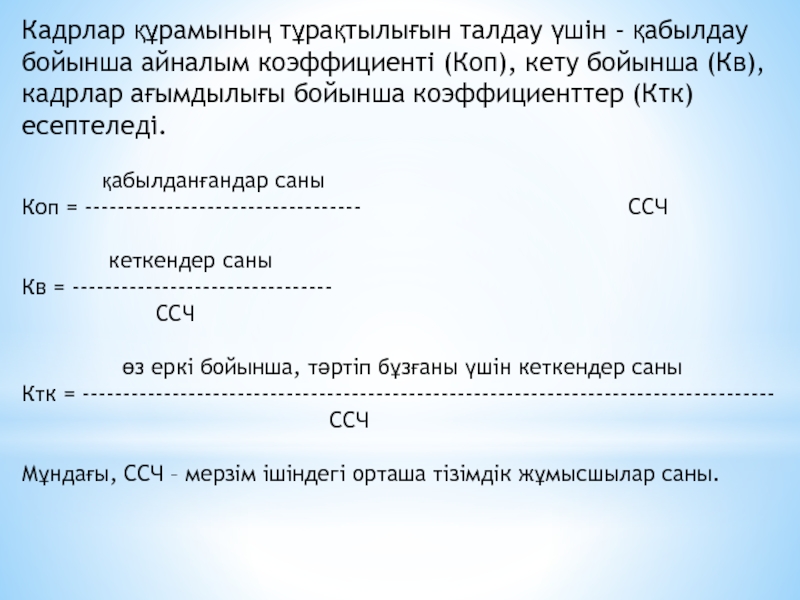 (Коп), кету бойынша (Кв), кадрлар ағымдылығы бойынша коэффициенттер (Ктк) есептеледі.