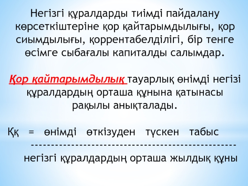 Слайд 10Негізгі құралдарды тиімді пайдалану көрсеткіштеріне қор қайтарымдылығы, қор сиымдылығы, қоррентабелділігі,